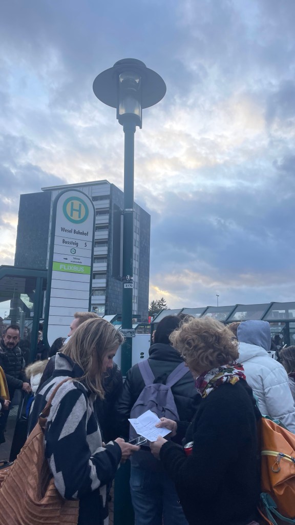 After speaking to the ticket office a second new route was proposed. From here, two more trains, and we should make it to Amsterdam around 6, just 3hrs later than expected. The delays and problems were comical at this point, but we still had plenty of time so we’d get there eventually. Or not. The new train arrives, and we start moving, we’re on our way to Arnhem, the final transit location of our journey. The trains are packed, there are so many of us in the same situation, and we are just packed in on top of each other with all our luggage. There’s no room to move, or sit. It’s not pleasant, but it is what it is. Less than halfway to Arnhem, the train stops, this time declaring that we must get off and take a replacement bus the rest of the way to Arnhem. In turn this meant we would miss the planned connection in Arnhem but inconveniently we could take a later one. So here we are, well over 100 people, standing around waiting for the bus. At this stage, it’s freezing cold, windy, threatening to rain and getting dark. When the bus never turns up, it was getting a bit concerning. People were starting to get taxis, an 1.5hr journey to Arnhem from here, and crazy prices + demand. There’s a couple of workers in hi-vis, we ask them, they have no idea where the bus is, or if any more trains will run. It was simply confused mayhem.