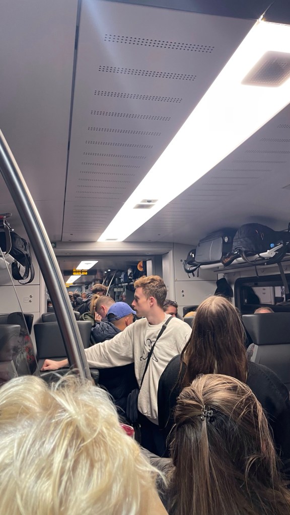 It all started a couple of hours into the journey, when the train stopped and declared it would not be continuing due to “technical issues”. This caused a little chaos, but was not unexpected of Deutsche Bahn (the German train company) who are known to be unreliable and problematic. So here we are sitting at the small station of Wolfsburg, Germany, in the freezing cold as we wait for an alternate train. This new route would require us to take 2 more trains, and have us getting in about an hour later than originally planned. Not ideal, but manageable. It’s at this point I make a new friend – shout out to Marianne, an Australian studying abroad in France, we kept each other sane throughout the day. Finally we’re onto the next train and it’s smooth sailing, after a little bit of confusion about station names and where we must get off to transfer, we disembark at Duisburg (not Düsseldorf!). From here it’s just one more train, straight to Amsterdam. Easy. We did the usual, check the platform exists, and that the correct train is displayed on the board, then went off to get some snacks. By the time we return to the platform, our train route was displayed with a large X next to it. What does that even mean?? Our train was cancelled. Storm Ciaran was having some severe impacts across the Netherlands and there was a tree down across the track.