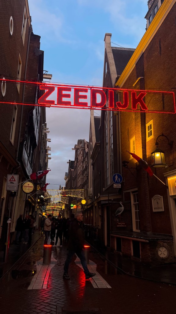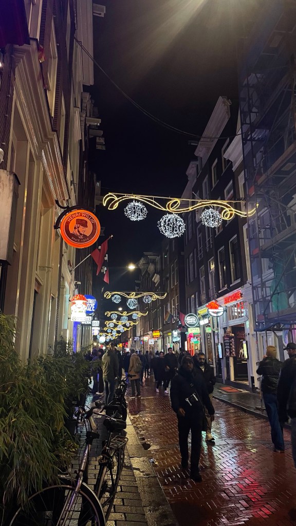 Waking up in Amsterdam, I was ready to go and see the city. I spent most of the morning enjoying walking through the cobbled streets and around the canals. Amsterdam was beautiful, and the Christmas decorations that were up certainly added to this. It felt like a true stormy, wintery day, one you’d see in the movies. I couldn’t believe how busy and bustling the streets were, even with the rain and wind.