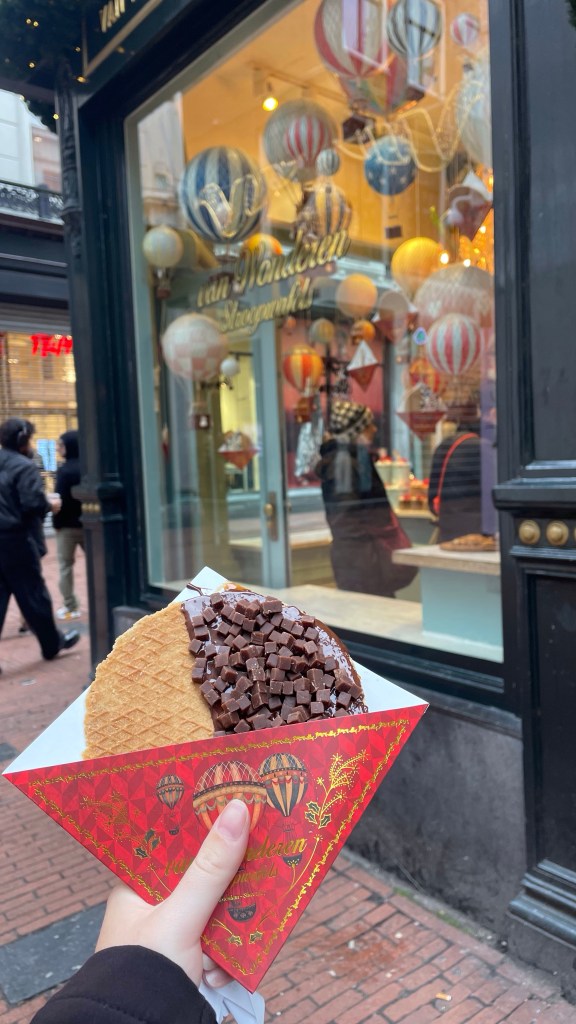 Nothing in Amsterdam opened until 10am at the earliest, sometimes 11 or 12 even. While this has not been uncommon across Europe, it was next level here. I tried the van Wonderen stroopwafels (two thin, crispy waffels, with caramel filling between, chocolate dipped and topped with something sweet) for breakfast, they were good but damn they were sweet. They were also expensive. I didn’t think about the conversion at the time but I paid $23NZD, for something that was basically a snack. However I will note, that in general, Amsterdam is not a cheap city, it is definitely more expensive than many others. After this I made my way to the Tonys chocolate factory to make my own custom choccy bar. I arrived just after opening and there was little to no queue. Here you could pick the type of chocolate (white,milk,dark) and then two toppings from a wide range, you even got to pick the packaging colours. I selected a combination of white and milk chocolate, with biscuit pieces and popping candy. An odd combo, but it was good!!