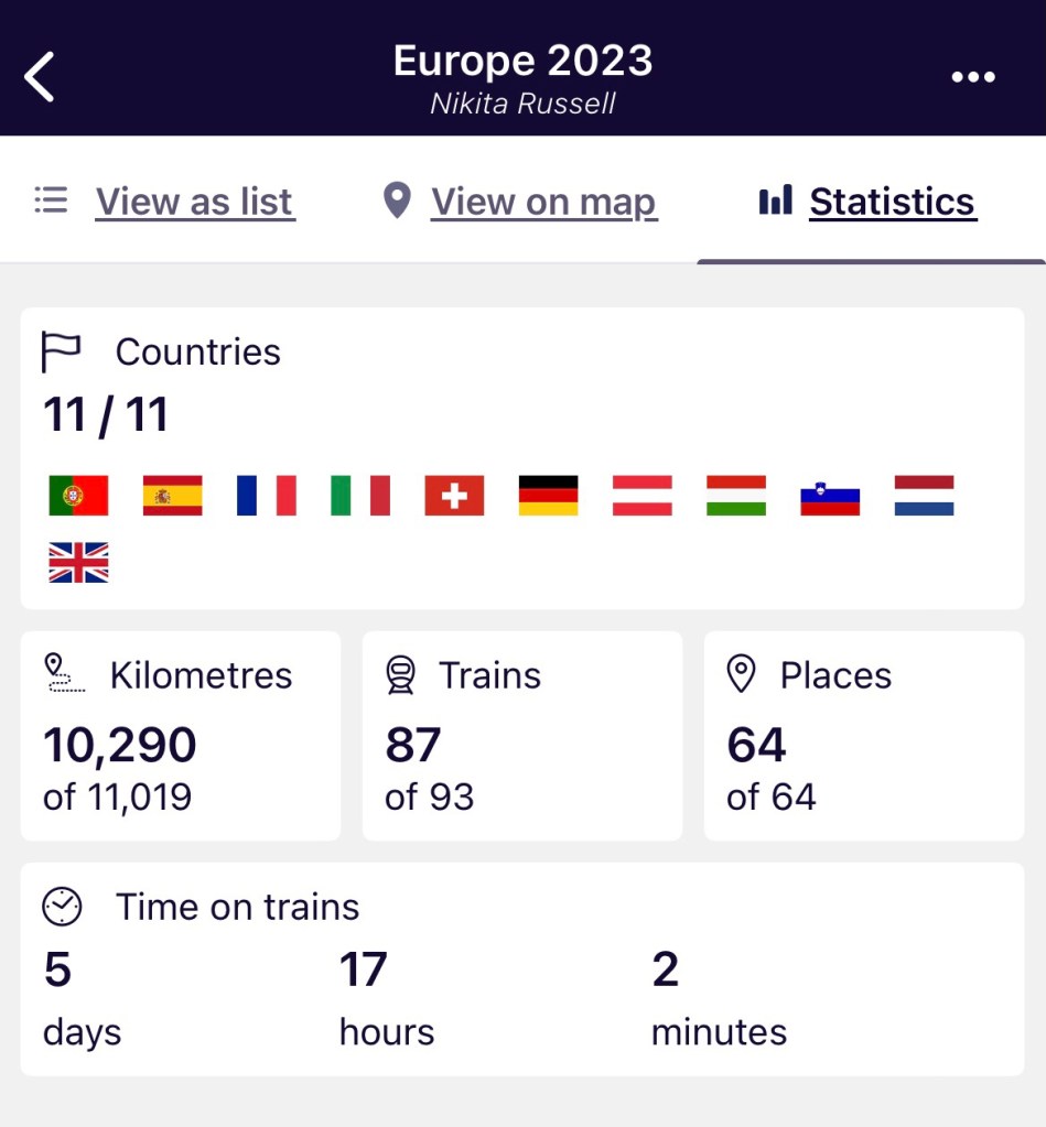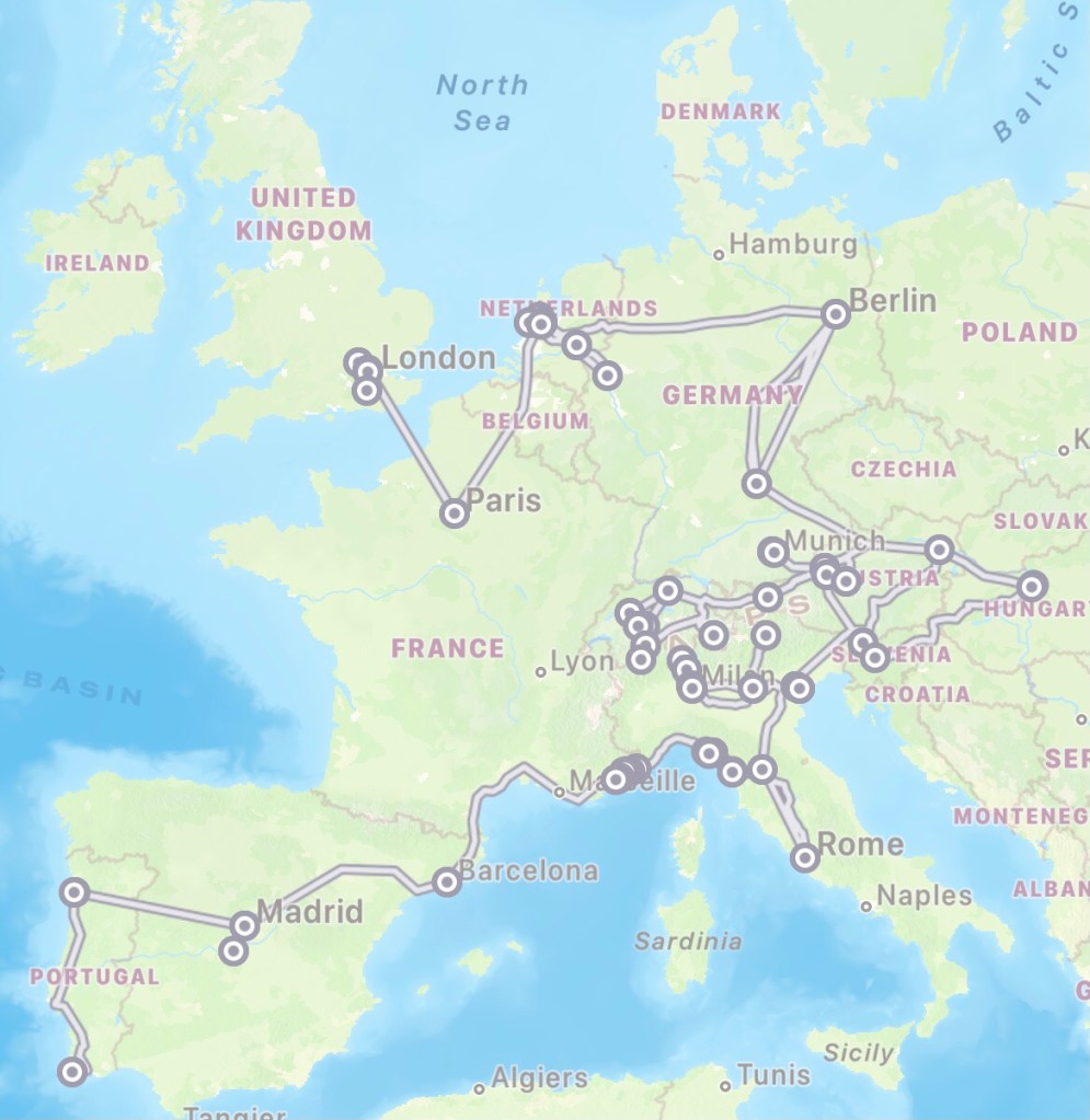 Over 16 weeks, 113 days, I travelled to 15 different countries visiting over 30 different towns/cities. I used an Eurail Pass to get around by train and I spent the equivalent of almost 6 entire days on trains! I loved the ease and accessibility of train travel (except in Germany).