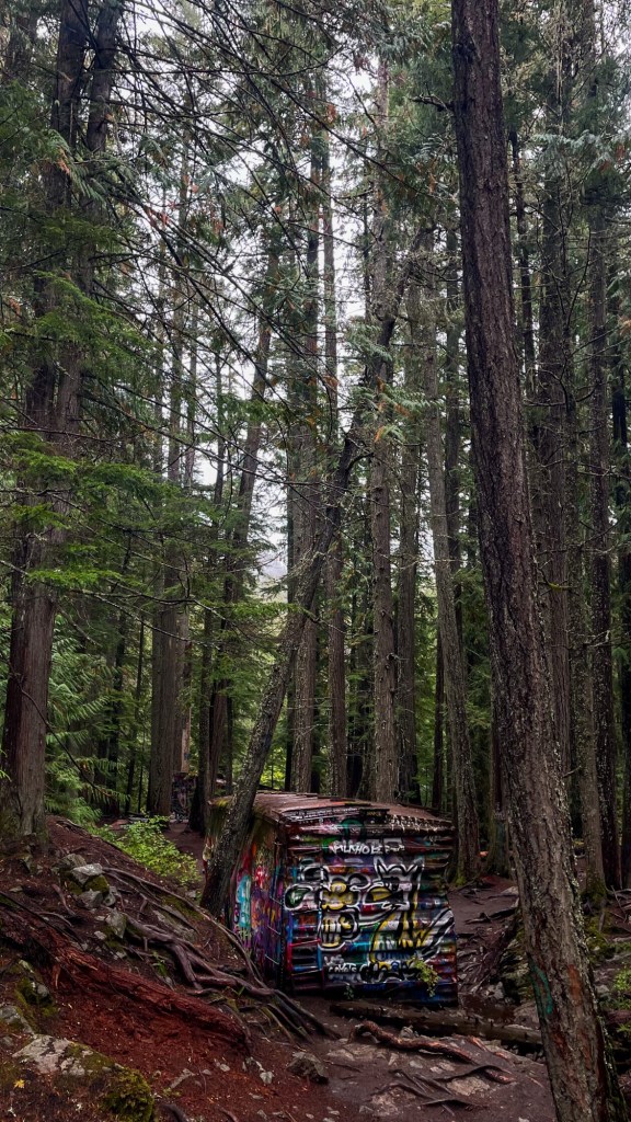 The first hike I did was to an old train wreck. There was a train accident in the 1950’s on a key railway between Vancouver and the communities up here. In order to reopen the railway as soon as possible they removed the unsalvageable carriages and dumped them. Since, they have been covered in graffiti and have created quite the artistic destination. This was a short hike, about 1hr return, through the forest. I did it in the rain, but it was still really cool!